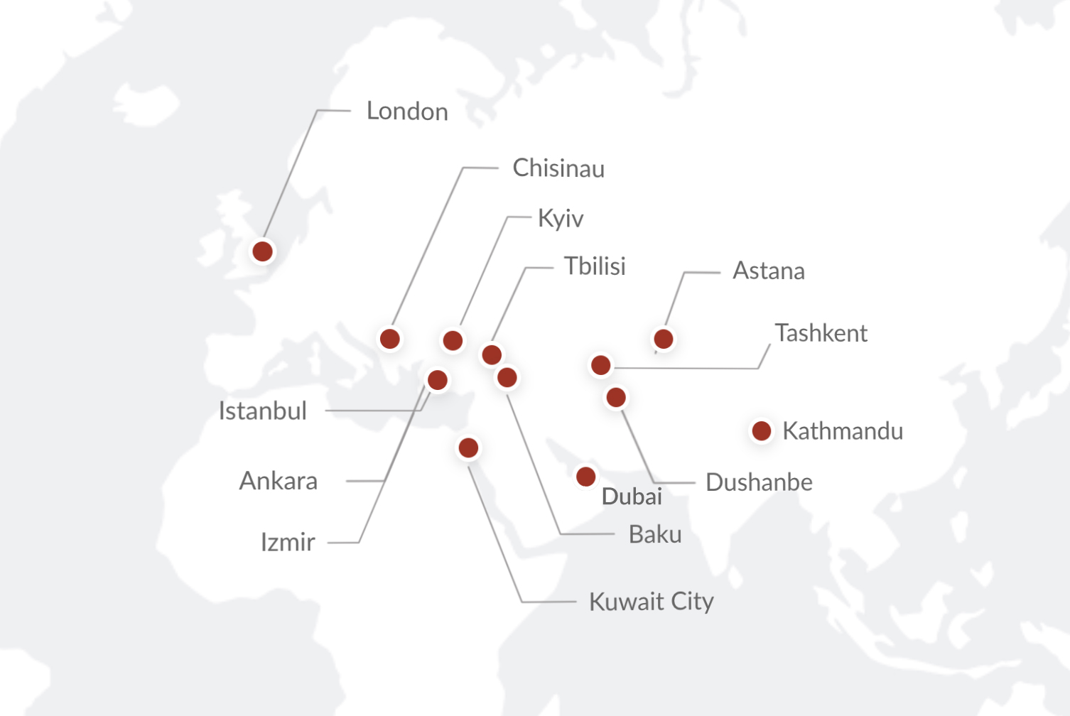 Izmir Ankara Istanbul London Chisinau Kyiv Tbilisi Baku Kuwait City Dushanbe Astana Tashkent Kathmandu Dubai